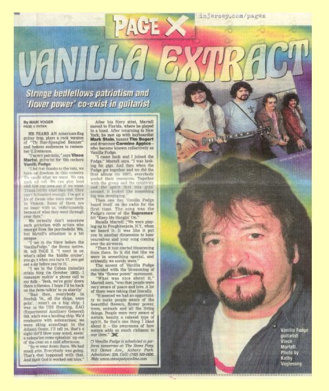 Mark Voger He wears an American-flag guitar strap, plays a rock version of "The Star-Spangled Banner" and beckons audiences to remember U.S. veterans. "I'm very patriotic," says Vince Martell, guitarist for '60s rockers Vanilla Fudge. "I feel that thanks to the vets, we have our freedom in this country. We can do what we want. We can rock and roll. We can play loud and blow our ears out if we want. Thank God for what they did. They can't be thanked enough. I've got a lot of friends who were over there in Vietnam. Some of them are no longer with us, unfortunately, because of what they went through over there." We normally don't associate such patriotism with artists who emerged from the psychedelic '60s, but Martell's situation is a bit unique. "I was in the Navy before the Vanilla Fudge," the Bronx native, 56, tells PAGE X. "I went in on what's called the 'kiddie cruise'; you go in when you turn 17, you get out a day before you're 21. "I was in the Cuban (missile) crisis thing (in Oct. 1962). I remember makin' a phone call to my folks -- 'Yeah, we're goin' down there to Havana. I hope I'll be back on the phone talkin' to ya shortly.' "Back then, everybody in Norfolk, Va., all the ships, were goin'. I wasn't on a big ship; I was on the U.S.S. Hunting, EAG (Experimental Auxiliary General) 398, which was a landing ship. We'd rendezvous with submarines; we were taking soundings in the Atlantic Ocean. I'll tell ya, that's a sight that'll blow your mind, seein' a submarine come splashin' up out of the ocean on a cold afternoon. "So we went down there. We had small arms. Everybody was going. That's what happened with that. And thank God it worked out nice." After his Navy stint, Martell moved to Florida, where he played in a band. After returning to New York, he met up with keyboardist Mark Stein, bassist Tim Bogert and drummer Carmine Appice-- who became known collectively as Vanilla Fudge. "I came back and I joined the Fudge," Martell says. "I was looking for gigs. And then when the Fudge got together and we did the first album (in 1967), everybody pooled their resources. Together with the group and the creativity and the spirit that was goin' around, it looked like something big was developing." Then one day, Vanilla Fudge heard itself on the radio for the first time. The song was the Fudge's cover of the Supremes' hit "Keep Me Hangin' On." Recalls Martell: "We were playing up in Poughkeepsie, N.Y., when we heard it. It was like it put you in another dimension to hear yourselves and your song coming over the airwaves. "Then it just started blossoming from there. So it did feel like we were in something special, and evidently, we surely were." The ascent of Vanilla Fudge coincided with the blossoming of the '60s "flower power" movement. "What was nice about it," Martell says, "was that people were very aware of peace and love. A lot of them were taking that literally. "It seemed we had an opportunity to make people aware of the beautiful flowers, flower power, trees, animals and all the living things. People were very aware of nature, beauty, a relaxed type of spirit. So that's one thing I liked about it -- the awareness of how nature adds so much richness to our lives." |
